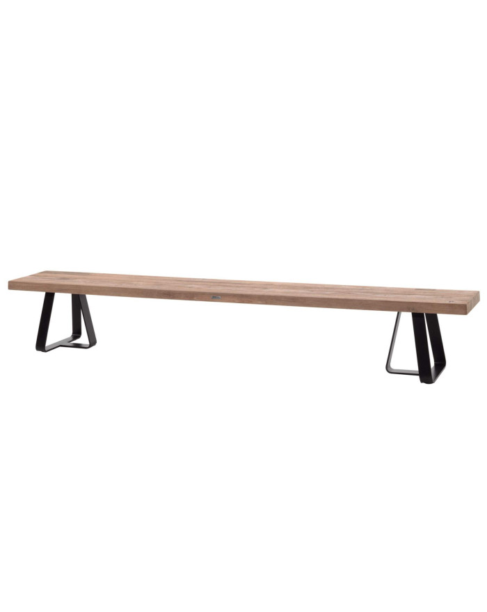 En teck massif recyclé, ce banc résiste parfaitement à l’humidité et aux intempéries.