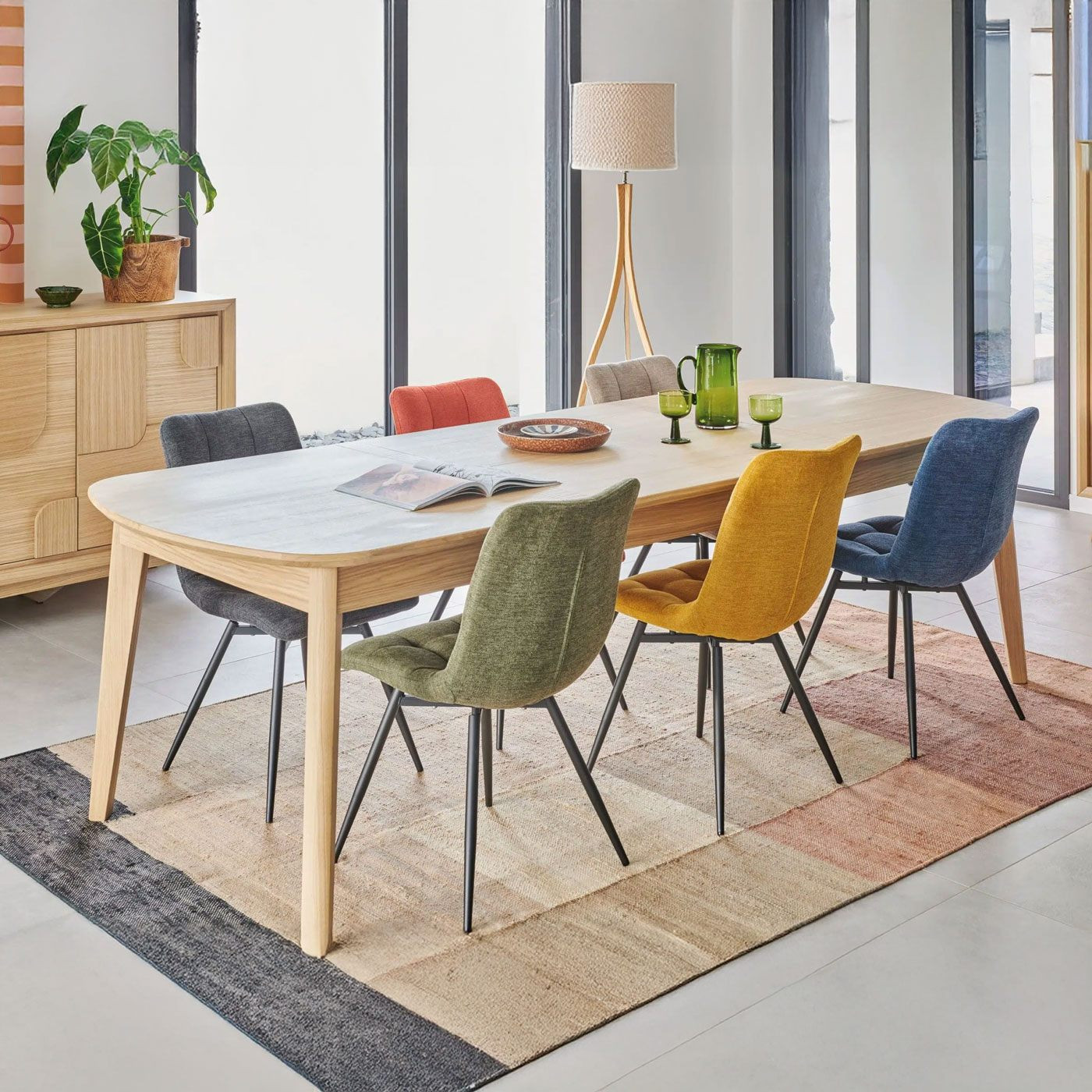 La table en chêne Rivage est une table chêne moderne extensible qui associe plateau tonneau aux bords arrondis et teinte lumineuse pour réchauffer la salle à manger.